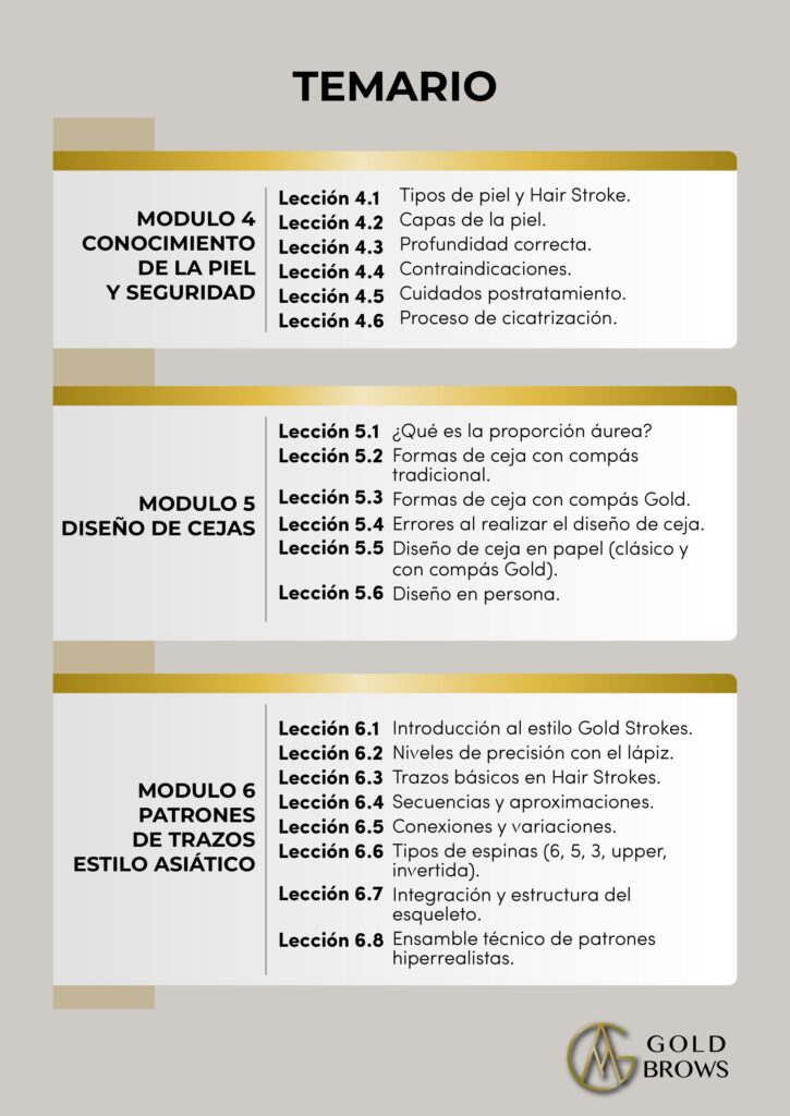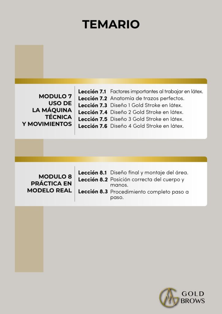 • Patrones hiperrealistas – Domina los 5 tipos de espina (6, 5, 3, upper, invertida) aplicados según cada tipo de ceja.